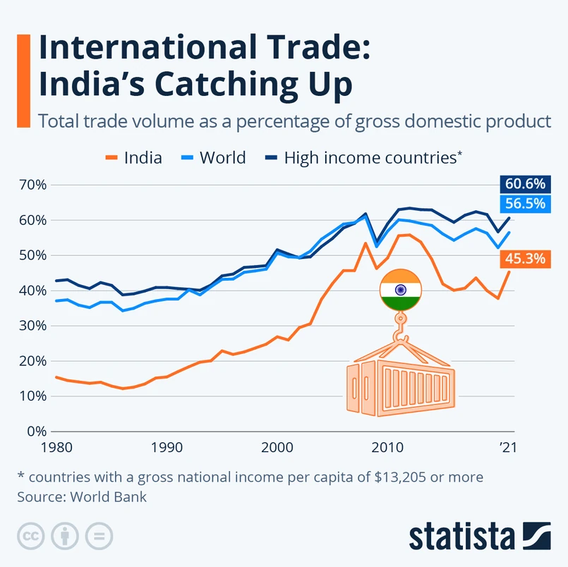 W latach 80. wartość wolumenu międzynarodowego handlu do PKB Indii wynosiła zaledwie 12-15 proc., w następnej dekadzie wzrosła do poziomu 15-27 proc., by w 2021 roku wynosić 45 proc. W pewnym momencie wartość ta przekraczała 50 proc.