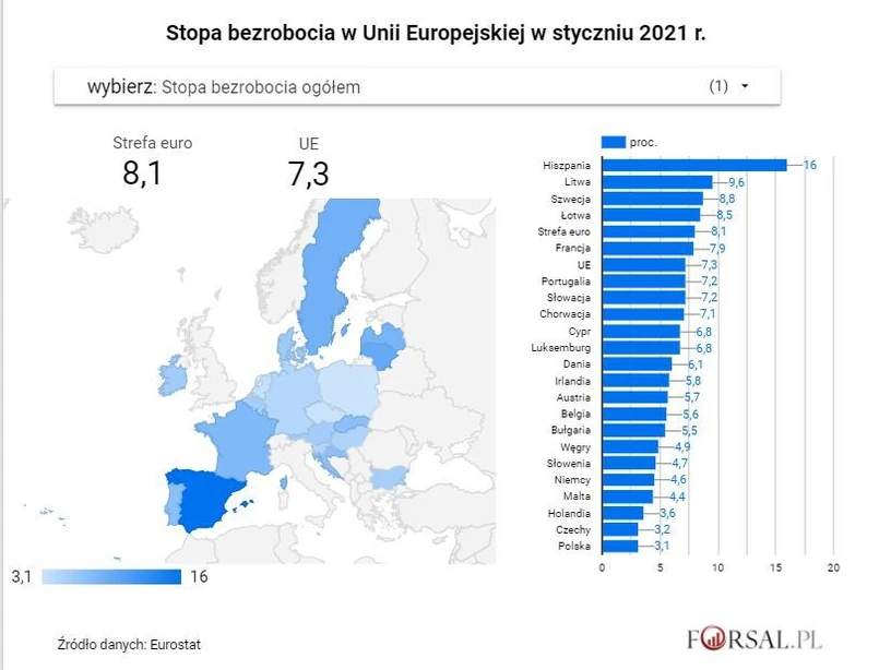 Jak poinformował w czwartek urząd statystyczny Unii Europejskiej (Eurostat), stopa bezrobocia w styczniu, po dostosowaniu sezonowym, według metodologii Eurostatu, wyniosła w Polsce 3,1 proc. wobec 3,2 proc. w grudniu 2020 r. Polska zajęła tym samym pierwsze miejsce w UE pod względem najniższego bezrobocia w Europie. Liczba bezrobotnych w pierwszym miesiącu 2021 r. wyniosła 531 tys. wobec 542 tys. w grudniu.