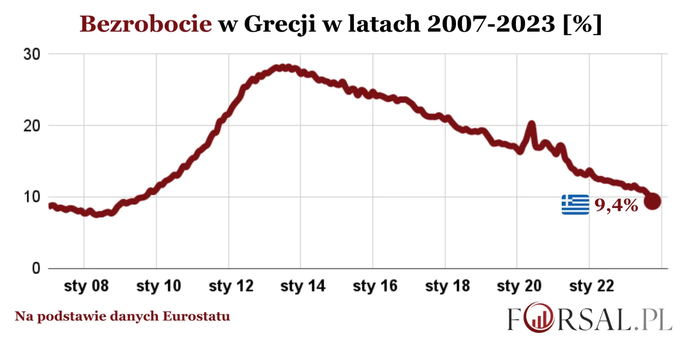 Najgorzej było w 2013 roku, gdy bezrobocie potrafiło przekraczać 28 proc. Od początku 2014 roku grecka stopa bezrobocia zaczęła spadać. W styczniu 2015 roku było to 25,7 proc., a rok później 24,7 proc. Ten spadek był kontynuowany aż do wybuchu pandemii COVID-19. W lutym 2020 roku bez pracy pozostawało już 16,3 proc. Greków. Następne miesiące przyniosły dynamiczny wzrost stopy bezrobocia, ponieważ ta w czerwcu tego roku wynosiła już 20,3 proc. Był to najwyższy poziom od 2018 roku.