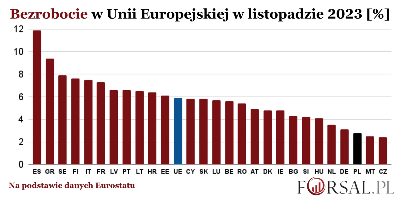 Tym, co może cieszyć, jest fakt, że bezrobocie w Polsce nie rośnie. W listopadzie wyniosło ono zaledwie 2,8 proc., co oznacza, że kolejny miesiąc z rzędu pozostaje ono bez zmian. Niższe odnotowano jedynie na maleńkiej Malcie (2,5 proc.) oraz u naszego południowego sąsiada — Czech (2,4 proc.). Zaraz za nami uplasowały się Niemcy, gdzie jako bezrobotny określiło się 3,1 proc. osób.
