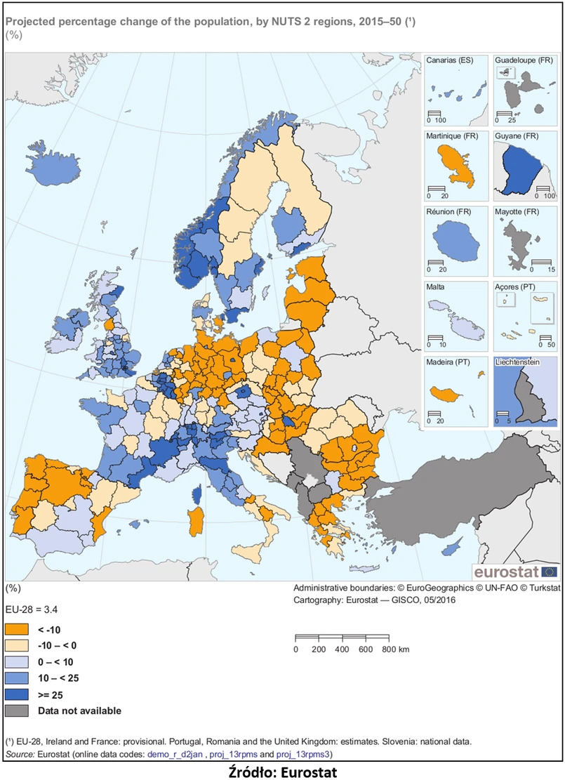Na poniższej mapie szczególnie interesujące wydają się te regiony NUTS 2, dla których od 2015 r. do 2050 r. prognozowany jest największy spadek liczby ludności (kolor pomarańczowy) oraz jej największy wzrost (kolor niebieski). Jak nietrudno zauważyć, nie tylko prawie cała Polska stanowi obszar mocno zagrożony depopulacją. To samo można powiedzieć np. o praktycznie całych Niemczech, krajach bałtyckich, południowych Włoszech, południowej Rumunii, Bułgarii, prawie całej Grecji oraz północno - zachodniej części Półwyspu Iberyjskiego.