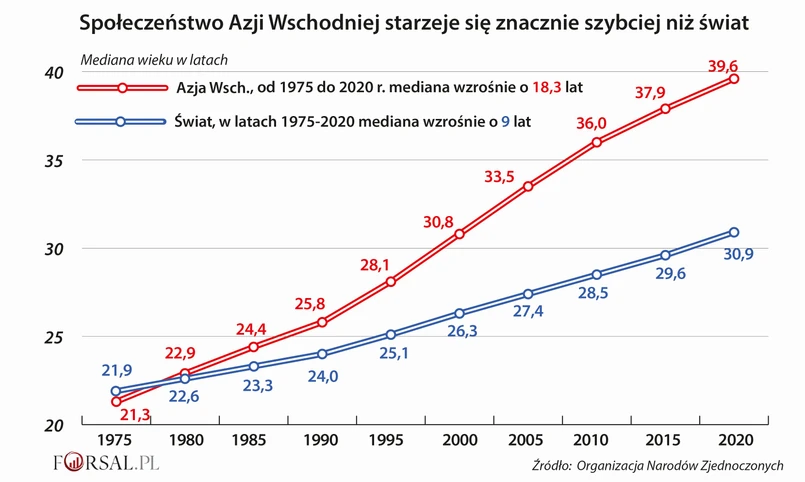 Ta demograficzna zmiana wciąż będzie się pogłębiała: prognozy ONZ przewidują, że średni wiek mieszkańca Azji Wschodniej będzie rósł szybciej, niż w innym regionie świata, przez kolejne 25 lat.