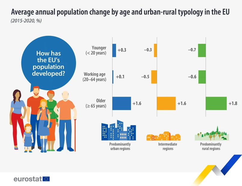 W ciągu ostatnich kilku lat (2015–2020) liczba ludności rosła w stosunkowo szybkim tempie (co najmniej 0,3 proc. rocznie) w 108 przeważnie wiejskich regionach UE. Z kolei liczba ludności spadała w stosunkowo szybkim tempie (poniżej - 0,3 proc. rocznie) w 155 regionach, w których dominują obszary wiejskie.