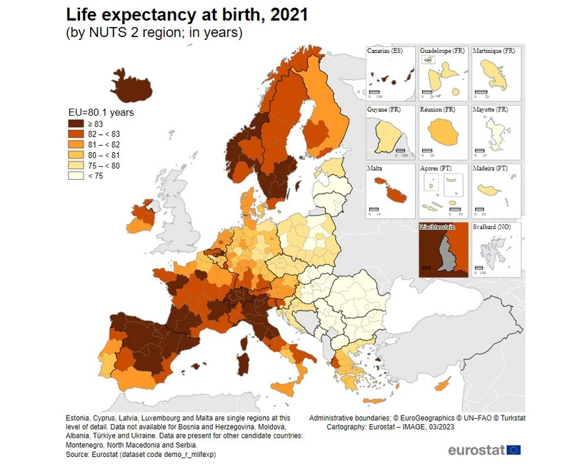 W 2021 r. regiony UE o najwyższej oczekiwanej długości życia w chwili urodzenia znajdowały się w Hiszpanii, we Włoszech i we Francji.