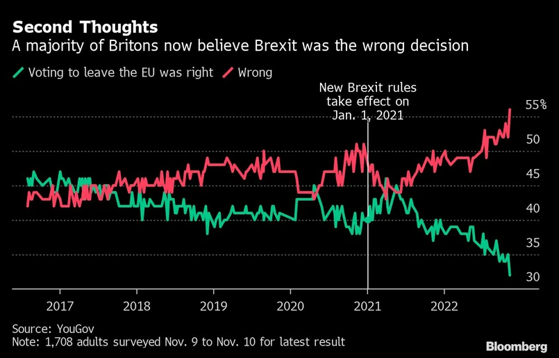 Brexit wrócił na polityczną agendę w Wielkiej Brytanii wraz z doniesieniami, że rząd Rishiego Sunaka może dążyć do zacieśnienia więzi z Unią Europejską. Zarówno premier, jak i jego kanclerz skarbu, Jeremy Hunt, zaprzeczyli, że dążą do porozumienia z UE w stylu szwajcarskim. Upierają się, że ich priorytetem jest sprawnie działająca umowa o handlu i współpracy między UE a Wielką Brytanią podpisana w 2020 r. Jednak sondaże pokazują, że większość Brytyjczyków uważa teraz, że brexit był błędną decyzją.