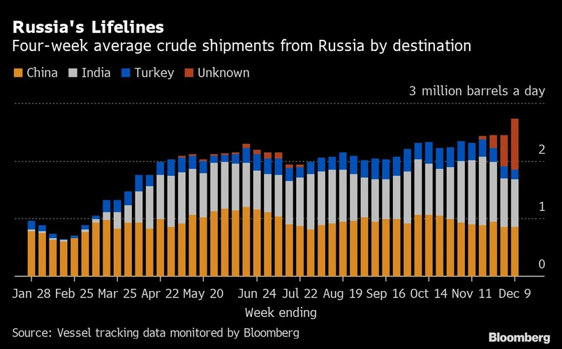 1/15 Ponad połowa ropy ładowanej z portów na Bałtyku, Morzu Czarnym i Arktyce kierowana jest do Kanału Sueskiego na statkach, które nie wskazują miejsca docelowego. Nie jest jasne, czy cała ta ropa została sprzedana, czy też ładunki są wysyłane do regionu w nadziei, że zostaną sprzedane, zanim dotrą. Ilość ropy na statkach płynących do Chin, Indii i Turcji, trzech krajów, które stały się największymi nabywcami rosyjskich dostaw, a także ładunki na statkach, które jeszcze nie wskazują miejsca docelowego, skoczyły w ciągu czterech tygodni do 9 grudnia do średnio 2,73 miliona baryłek dziennie. To ponad czterokrotnie więcej niż wolumen wysłany w ciągu czterech tygodni bezpośrednio przed inwazją Rosji na Ukrainę pod koniec lutego. Tankowce przewożące rosyjską ropę coraz bardziej ostrożnie podchodzą do swoich miejsc docelowych. Ilość ropy na statkach wypływających z Bałtyku i kierujących się do Port Said lub Kanału Sueskiego wzrosła do 890 tys. baryłek dziennie. Jest prawdopodobne, że wiele z tych statków zacznie sygnalizować porty indyjskie po przepłynięciu przez kanał. Także dostawy do Zjednoczonych Emiratów Arabskich stają się coraz bardziej powszechne. W pierwszym tygodniu po wejściu w życie unijnego zakazu, całkowity wolumen ropy naftowej wysyłany z Rosji wzrósł o 468 tys. baryłek dziennie do 3,45 miliona w ciągu siedmiu dni poprzedzających 9 grudnia. Mniej podatna na zmiany średnia z czterech tygodni również wzrosła.