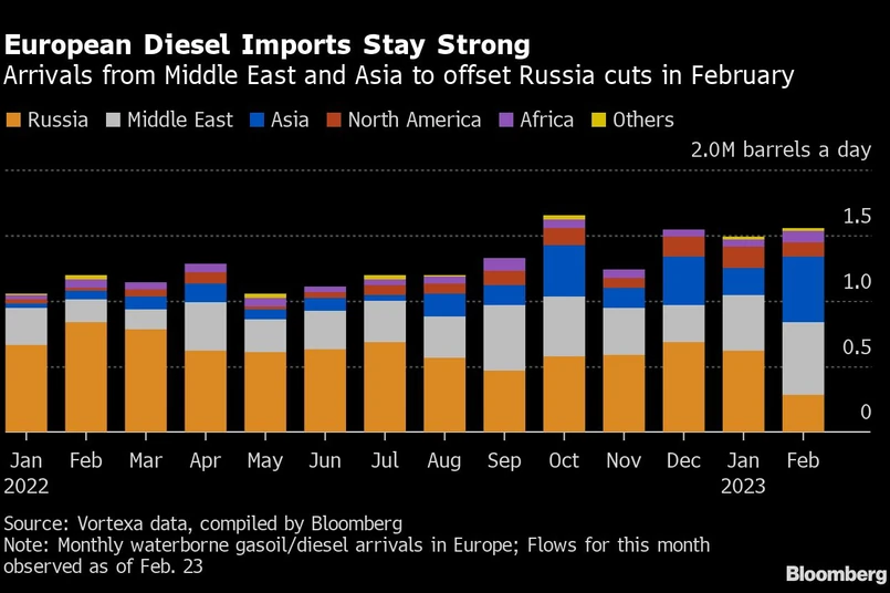 2/5 Olej napędowy. We wtorek w Londynie rozpoczyna się Międzynarodowy Tydzień Energii. Zgromadzi on czołowych liderów branży, inwestorów i przedstawicieli rządu w celu omówienia bezpieczeństwa energetycznego i finansów, zmian klimatycznych, popytu ze strony Chin i skutków rosyjskiej inwazji na Ukrainę. W lutym do Europy nadal płynie olej napędowy z Rosji, nawet po wejściu w życiu sankcji na zakupy od jego byłego głównego dostawcy. Rosyjskiego diesela było mniej, ale całkowity import nieznacznie przekroczy poziom ze stycznia, głównie z powodu dostaw z Bliskiego Wschodu i Azji.