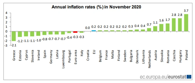 W całej UE inflacja wyniosła w listopadzie br. 0,2 proc. rok do roku wobec 0,3 proc. miesiąc wcześniej.
