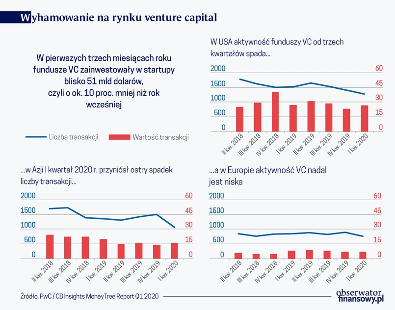 Z danych zawartych w raporcie „MoneyTree Report Q1 2020” opublikowanym przez PwC i CB Insights wynika, że w pierwszych trzech miesiącach roku fundusze VC zainwestowały w start-upy łącznie blisko 51 mld dolarów, czyli o ok. 10 proc. mniej niż rok wcześniej. Za spadek odpowiada przede wszystkim Azja, gdzie wartość inwestycji zmniejszyła się o 20 proc. do 16 mld dolarów.