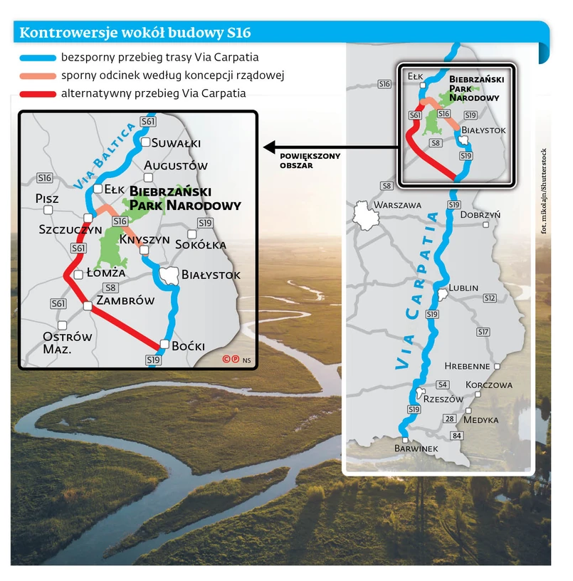 Via Carpatia to inwestycja strategiczna dla rządu. Ma stać się kręgosłupem komunikacyjnym dla wschodniej Polski, a w przyszłości również ważnym szlakiem dla regionu Trójmorza. Będzie przebiegać z Litwy przez Polskę, Słowację, Węgry, Rumunię, Bułgarię aż po Grecję. Na terenie naszego kraju Via Carpatia w dużej mierze powstanie na bazie zaplanowanej wzdłuż wschodniej granicy trasy ekspresowej S19. Ma prowadzić od przejścia z Białorusią w Kuźnicy Białostockiej do granicy ze Słowacją w Barwinku. Ten przebieg raczej nie budzi sporów. Problem jest za to z odcinkiem trasy Via Carpatia w stronę krajów nadbałtyckich. Drogowcy chcą, by łącznik między trasami S19 i S61 (Via Baltica) prowadził od Knyszyna do Ełku i tym samym przeciął Biebrzański Park Narodowy. Na tym fragmencie przebiegałby jako droga S16. Wśród proponowanych wariantów pojawił się niedawno też taki, który zakłada poprowadzenie ekspresówki mniej więcej po obecnej drodze nr 8 – od Knyszyna przez Korycin, Augustów do miejscowości Raczki, gdzie arteria połączyłaby się z biegnącą na Litwę trasą S61. W tej wersji trasa też przecięłaby biebrzańskie bagna. Wobec wszystkich zgłaszanych wariantów ostro protestują społecznicy i ekolodzy. – Via Carpatia ma być drogą z Grecji do krajów nadbałtyckich. Dlaczego musi akurat przecinać cenne przyrodniczo tereny Biebrzańskiego Parku Narodowego? – dziwi się Małgorzata Górska z Fundacji Dla Biebrzy. Dodaje, że nie da się tak zbudować trasy, by nie zaszkodzić przyrodzie. Przekonuje, że droga zniszczy dolinę Biebrzy i chroniący ją największy w Polsce park narodowy. Zagrożone byłyby obszary Natura 2000, miejsca ochrony rzadkich ptaków wodno-błotnych.