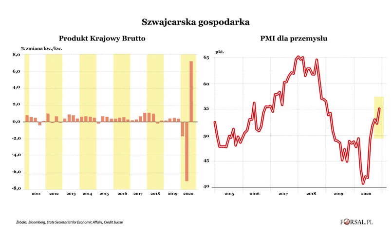 Produkt krajowy brutto, napędzany wzrostem konsumpcji oraz inwestycji w sprzęt i budownictwo, wzrósł o 7,2 proc. w trzecim kwartale tego roku. To więcej niż 6 proc. prognozowane w ankiecie ekonomistów Bloomberga. Wzrost nastąpił po 7-proc. spadku PKB, jaki Szwajcaria zanotowała w poprzednich trzech miesiącach.
