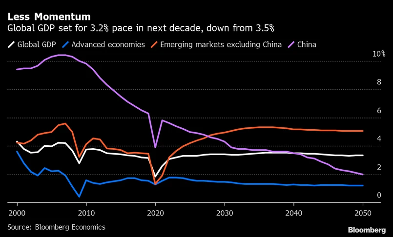 Analitycy Bloomberga prognozują, że sytuacja w najważniejszych gospodarkach na świecie będzie się dynamicznie zmieniała. Najbardziej widoczne będzie to w przypadku China, które w pierwszej dekadzie obecnego stulecia rosły o ponad 10 proc. rocznie, a po 2030 roku będą już tylko poniżej 4 proc. Państwo Środka utraci również przed 2030 rokiem pozycję lidera wzrostu na rzecz gospodarek krajów rozwijających się, dla których trwająca dekada ma być okresem stabilnego i silnego zwiększania się PKB.