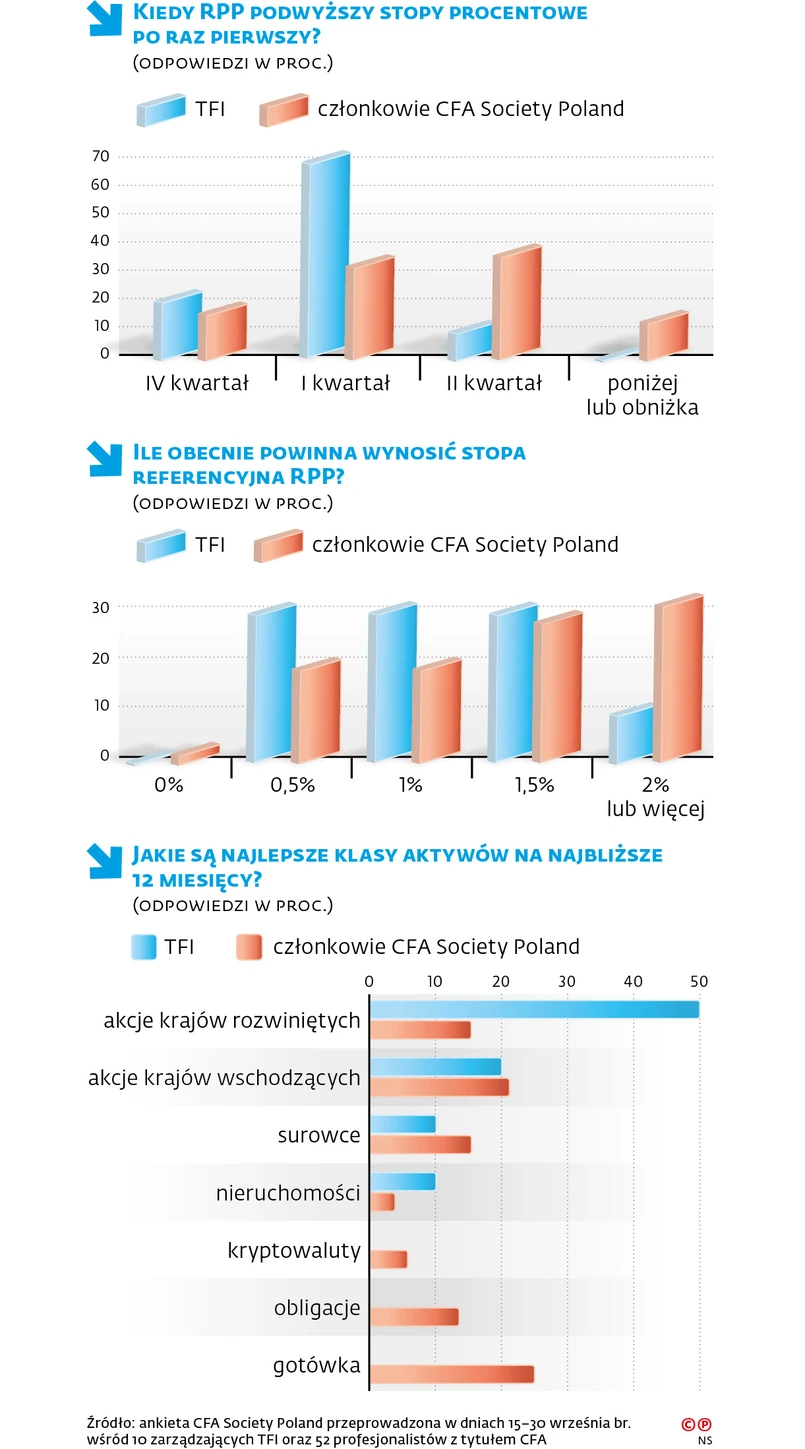 CFA Society Poland, która zrzesza profesjonalistów rynków finansowych, spytała swoich członków oraz przedstawicieli towarzystw funduszy inwestycyjnych (TFI), którzy na co dzień zarządzają dziesiątkami miliardów złotych powierzonych im przez Polaków, m.in. o to, kiedy nastąpi pierwsza podwyżka stóp procentowych u nas.