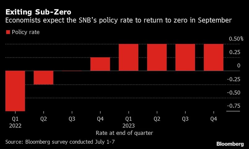 W kolejnych kwartałach spodziewane są podwyżki w wysokości 25 punktów bazowych, co oznacza, że Szwajcaria wyjdzie z ujemnych stóp procentowych na wrześniowym posiedzeniu, kończąc okres ponad siedmiu lat, gdy stopy procentowe były w strefie poniżej zera.