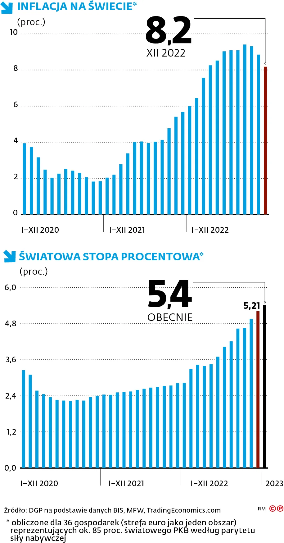 Od początku roku stopy podniosły banki centralne w niemal 20 krajach. DGP policzył wysokość średniej podstawowej stawki banku centralnego na całym świecie. Pod uwagę wzięliśmy stopy w ponad 30 krajach (do tego strefa euro, którą potraktowaliśmy jako jeden obszar gospodarczy). Każdemu państwu przepisaliśmy wagę odpowiadającą jego udziałowi w światowym PKB. Tak oszacowana stopa procentowa wynosi obecnie 5,4 proc. Przed rokiem byłoby to jeszcze 3,3 proc. Oszacowana w podobny sposób światowa inflacja według ostatnich danych - za grudzień 2022 r. - wyniosła 8,2 proc. wobec 9,4 proc. jeszcze trzy miesiące wcześniej. Do końca 2021 r. średnia inflacja na świecie nie przekraczała 6 proc.