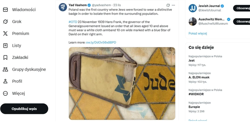 Jad Waszem (Yad Vashem) napisał w niedzielę na platformie X, że „Polska była pierwszym krajem, gdzie Żydzi zostali zmuszeni do noszenia wyróżniającej ich odznaki, w celu odizolowania ich od otaczającej ludności”. „23 listopada 1939 r. Hans Frank, gubernator Generalnego Gubernatorstwa, wydał rozkaz, zgodnie z którym wszyscy Żydzi w wieku 10 lat i starsi musieli nosić na prawym ramieniu białą, materiałową opaskę o szerokości 10 cm, oznaczoną niebieską Gwiazdą Dawida” – dodał instytut, zachęcając do zapoznania się z pełnym tekstem analizującym to antysemickie prawo.
