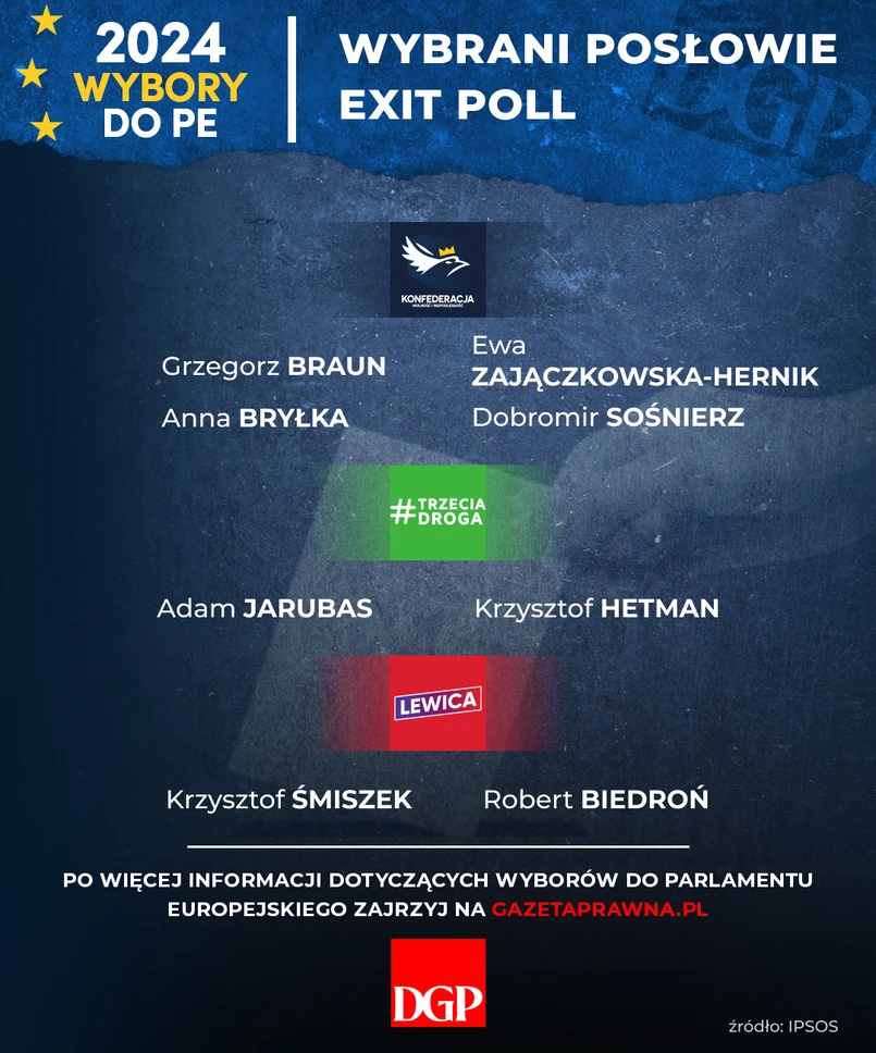 Według Ipsosu mandatu z list Konfederacji do PE nie wywalczyli m.in.: numer jeden na jej liście w okręgu kujawsko-pomorskim Przemysław Wipler, Tomasz Mentzen - brat jednego z liderów Konfederacji Sławomira Mentzena ani Konrad Berkowicz - "jedynka" Konfederacji w okręgu obejmującym woj. małopolskie i świętokrzyskie.