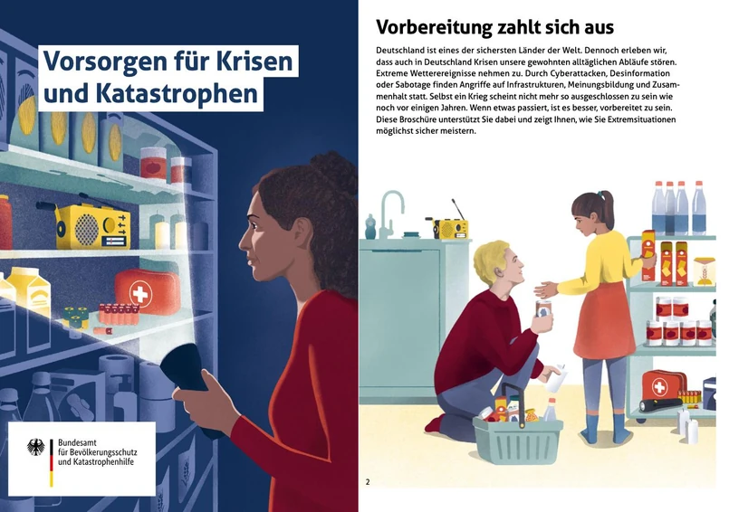 Niemieckie Federalne Biuro Ochrony Ludności i Pomocy w Katastrofach (BBK) zaleca każdemu domowi przygotowanie zapasu jedzenia i wody na co najmniej 10 dni. Na liście niezbędników znajdują się również latarki, radio na korbkę, powerbanki, apteczki i tzw. „Notfallrucksack”, czyli kryzysowy plecak z najpotrzebniejszymi rzeczami do ewakuacji.