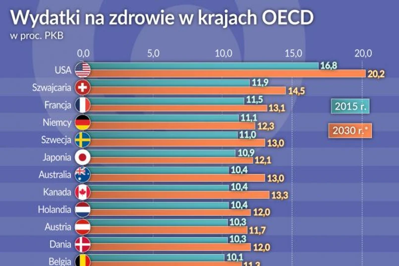W wariancie podstawowym swoich rozważań eksperci OECD przyjęli założenie braku w zbliżających się latach istotnych reform w organizacji służby zdrowia i leczenia w poszczególnych krajach członkowskich. Nawet przy braku zmian koszty będą wzrastać. W skali całego ugrupowania (plus Kolumbia, która wkrótce dołączy do składu organizacji) udział kosztów zdrowia w relacji do PKB podniesie się z 8,8 proc. w 2015 r. do 10,2 proc. w 2030 r. Mowa tu o łącznych wydatkach obejmujących razem leczenie publiczne i prywatne.