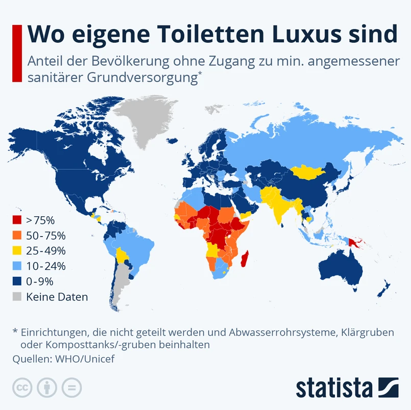 Największy problem występuje w Afryce. W Etiopii jedynie 9 proc. mieszkańców miało dostęp do prywatnych toalet, nieco więcej - 12 proc. – w Republice Czadu i na Madagaskarze. Zupełnie inaczej wygląda sytuacja w Afryce Północnej, tam z prywatnych toalet może korzystać zdecydowanie więcej osób – dla przykładu Libia (92 proc.) oraz Egipt (97 proc.)