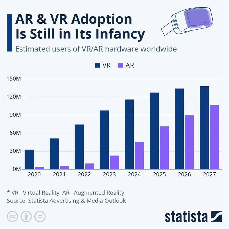 Statista szacuje, że w tym roku z wirtualnej rzeczywistości będzie korzystało na świecie 74 miliony osób, a z rozszerzonej mniej niż 10 milionów. Do 2027 roku liczba osób korzystających w obu technologii ma przekroczyć 100 milionów, ale to nadal niewiele w porównaniu z miliardami użytkowników smartfonów.