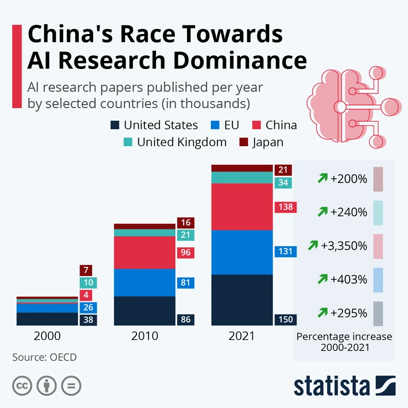 Stany Zjednoczone nadal przodują na świecie z około 150 000 prac naukowych na temat sztucznej inteligencji opublikowanych w ciągu jednego roku. Dorobek Chin na tym polu nie odbiega znacząco od amerykańskich standardów dzięki astronomicznemu wzrostowi nakładów na rozwój AI w ciągu ostatnich dwóch dekad. Państwo Środka przekroczyło liczbę artykułów naukowych dotyczących sztucznej inteligencji opublikowanych w 27 krajach UE łącznie w 2008 roku i obecnie zajmuje drugie miejsce z około 138 000 artykułów przesłanych do publikacji w 2021 roku. Oznacza to, że liczba publikacji na temat sztucznej inteligencji wzrosła o 3350 proc. w ciągu ostatnich dwóch dekad.