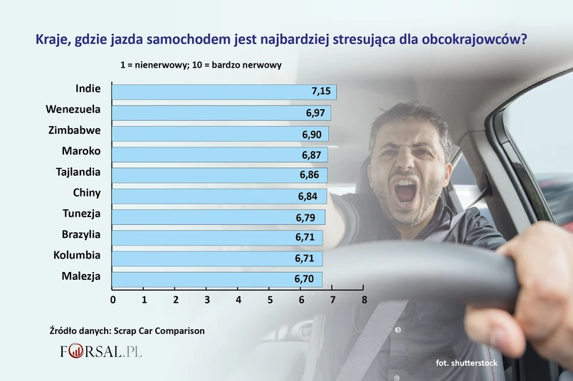 Indie są znane z tego, że dla przybysza z Europy lub USA, przyzwyczajonego do twardych zasad poruszeni się po drogach, ruch drogowy w Indiach to prawdziwy chaos. Badanie opublikowane w październiku potwierdziło tę opinię, pokazując, że kierowcy z innych państw najbardziej obawiają się wsiadania za kierownicę właśnie w Indiach. Kraj ten ze średnim wynikiem 7,15 na 10 pkt. znajduje się na szczycie listy 49 państw z najbardziej stresującym ruchem drogowym na świecie – podaje CNBC.