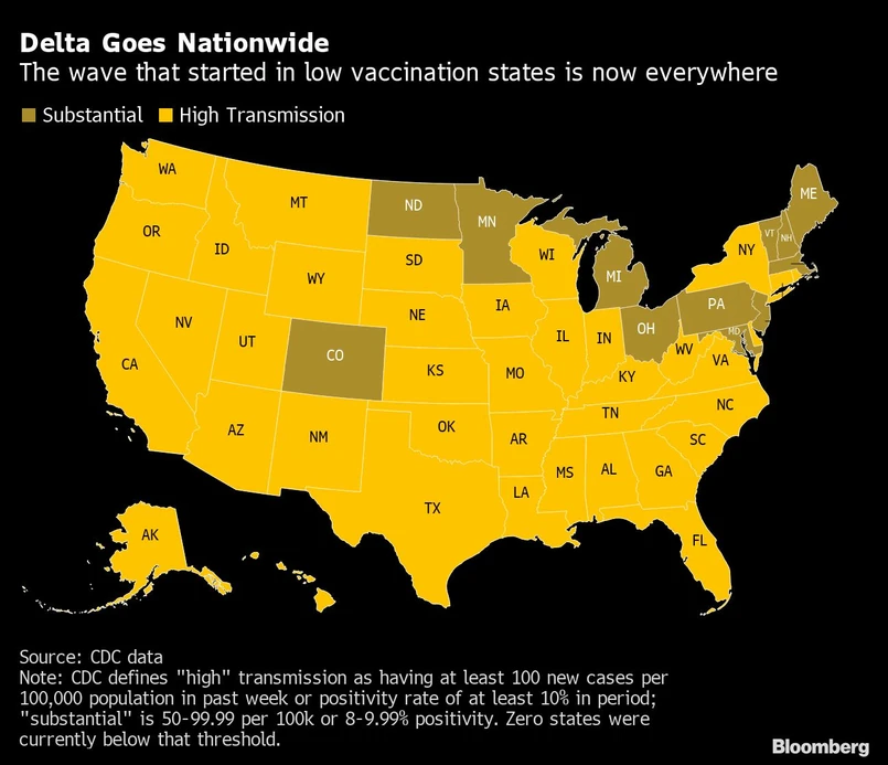 Jednak wariant, który szybciej się rozprzestrzenia, trafia nawet do stanów, które osiągnęły lepsze wyniki w kampanii szczepień i wprowadziły silne środki łagodzące. Według danych CDC w dwudziestu trzech stanach i stolicy kraju średnia liczba zachorowań w ciągu ostatnich siedmiu dni wzrosła o co najmniej 50 proc., w tym także w tak silnie zaszczepionych stanach, jak Vermont, stan Waszyngton i Hawaje.