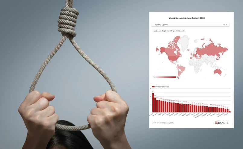 Polska ze wskaźnikiem na poziomie 11,5 samobójstw na 100 tys. mieszkańców plasuje się na 13. pozycji w zestawieniu 38. państw OECD. Podobnie jak we wszystkich innych krajach także w Polsce mężczyźni dużo częściej niż kobiety popełniają samobójstwa. Na 100 tys. Polaków płci męskiej średnio nieco ponad 21 (wskaźnik 21,1) skutecznie targnęło się na swoje życie, co plasuje nas na 10. pozycji wśród 38. ujętych w zestawieniu państw. Natomiast w przypadku kobiet wskaźniki wynosił tylko 2,9, co było 24. wynikiem w całym zestawieniu.