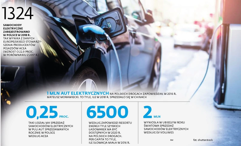 Milion aut elektrycznych na polskich drogach w 2025 r. zapowiedziany niemal trzy lata temu przez premiera Mateusza Morawieckiego to mrzonka, a plany coraz bardziej rozmijają się z rzeczywistością. Liczba rejestrowanych w Polsce e-aut wzrosła w 2018 r. o 22,9 proc., ale na koniec roku było ich w sumie tylko 2,5 tys., wobec 14 tys., które powinniśmy mieć według rządowego planu. Zdaniem naszych rozmówców z biegiem czasu nożyce między założeniami a faktycznymi zakupami jeszcze będą się rozwierać. Na koniec 2019 r. powinno być już 20 tys. elektryków. To nierealne, nawet jeśli weźmiemy pod uwagę coraz bardziej restrykcyjne normy dla silników spalinowych i taniejące baterie do aut elektrycznych. Jeśli elektryków będzie przybywało w tym samym tempie co w ub.r., to na koniec 2019 r. będzie ich w kraju 3 tys. Jeśli będzie przybywać ich w dotychczasowym tempie, w 2025 r. dojdziemy do… nieco ponad 12 tys.