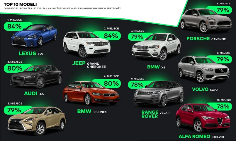 Wszystkie znajdujące się w rankingu auta mają jedną wspólną cechę: - bardzo wysoki wskaźnik udziału leasingu i wynajmu w sprzedaży ogółem wynoszący od 78% dla Alfy Romeo Stelvio do 84% w przypadku Lexusa GS. Oznacza to, że średnio jedynie co piąty samochód z prezentowanej listy trafia do klienta bez pośrednictwa podmiotów oferujących leasing lub wynajem długoterminowy. Struktura sprzedaży wygląda w ten sposób z prostego powodu. Do tej pory, leasing i wynajem długoterminowy były jednymi z najkorzystniejszych form finansowania samochodów firmowych, niezależnie od wartości auta. O ile niewiele zmieni się w tym zakresie dla samochodów o wartości do 150 tys. zł, to w przypadku drogich pojazdów, zmiana przepisów może mieć realny wpływ na wybór formy finansowania.