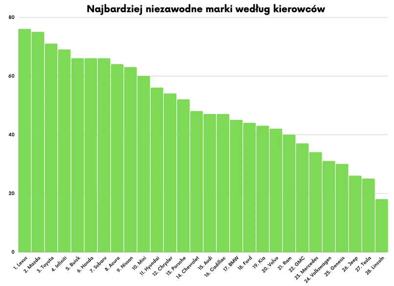 Zaskakująco słabo wypadły w badaniu marki europejskie. Najwyżej zajechało Mini (60 punktów), bo na 10 miejsce. W połowie stawki znalazło się Porsche i Audi (odpowiednio 52 i 47 punktów). Gorzej poszło BMW (45 punktów), a wręcz fatalnie wypadł Mercedes – jego średnia to zaledwie 34 punkty! Zaważyły na tym szczególnie złe oceny modelu GLE – otrzymał od właścicieli tylko 2 punkty! Dla porównania, jego konkurent od Lexusa, czyli model RX otrzymał aż 76 punktów.