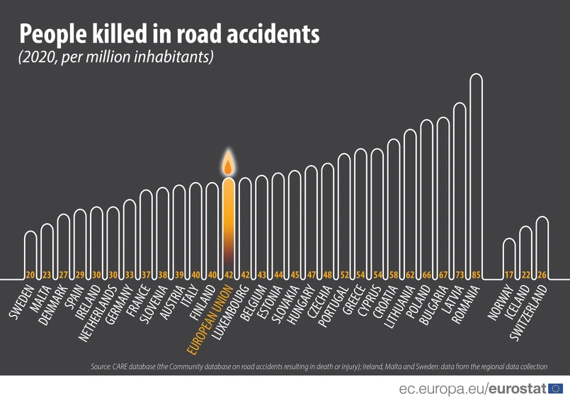 W porównaniu z populacją każdego państwa członkowskiego najniższe wskaźniki śmiertelności na drogach w 2020 r. odnotowano w Szwecji (20 ofiar ruchu drogowego na milion mieszkańców), Malcie (23), Danii (27) i Hiszpanii (29), przed Irlandią i Holandią (w obu 30).