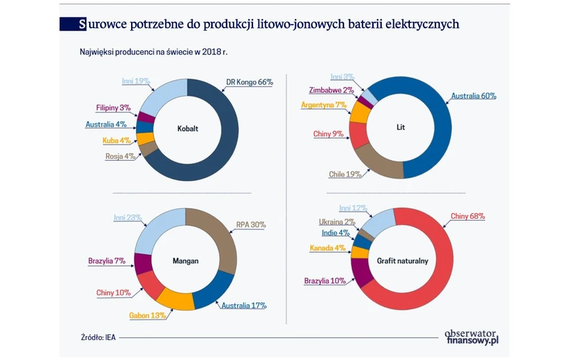 Światowa produkcja litu (głównym dostawcą jest Australia) wzrosła w tym samym czasie z 28,1 do 85 tys. ton. Globalne dostawy manganu powiększyły się w ostatniej dekadzie o 29 proc., z 3,9 tys. ton w 2010 r. do 18 tys. ton w 2018 r. Tej wzrostowej tendencji wydobycia i dostaw wśród głównych surowców niezbędnych do produkcji baterii elektrycznych nie poddaje się jedynie grafit. Wydobycie naturalnego grafitu załamało się w 2017 r. z powodu wprowadzenia obostrzeń ekologicznych w Chinach, ale powstałe niedobory wypełniane są m.in. przez produkcję grafitu syntetycznego.