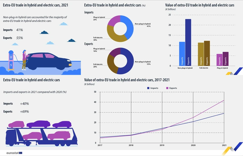 Pod względem wartości całkowity eksport samochodów hybrydowych i elektrycznych poza UE w 2021 r. osiągnął wartość 42 mld euro, co stanowi wzrost o prawie 800 proc. w porównaniu z 2017 r. (4,7 mld euro). Całkowita wartość importu wzrosła o ponad 400 proc. z 5,6 mld euro w 2017 r. do 29 mld euro w 2021 r.