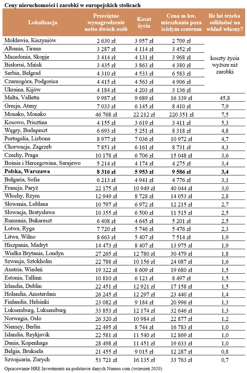 Daleko jest nam jednak do takich krajów jak Szwajcaria, Belgia, Dania, Islandia czy Niemcy, gdzie para musiałaby żyć oszczędnie tylko przez rok, aby zgromadzić niezbędny wkład własny do kredytu. Dzieje się tak pomimo relatywnie wysokich cen nieruchomości w stolicach (od 12 do prawie 34 tys. zł za metr). Łatwość zakupu nieruchomości wynika tam jednak przede wszystkim z wysokich dochodów. Oszacowaliśmy bowiem, że para powinna w tych lokalizacjach dysponować wynagrodzeniami w kwocie od 21 do prawie 54 tys. złotych miesięcznie. Tak przynajmniej sugerują statystyki.