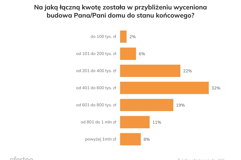 2/7 W badaniu zapytano również o średnie szacunkowe koszty budowy. Najczęściej, bo w 32% przypadków, inwestorzy na doprowadzenie domu do stanu końcowego planowali wydać między 401 a 600 tysięcy złotych. Następne były przedziały od 201 do 400 tysięcy złotych (22%) oraz od 601 do 800 tysięcy złotych (19%) – wynika z danych Oferteo.