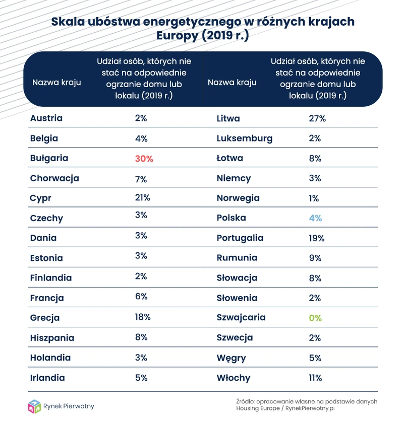 Dokładniejsze statystyki pokazują, że w 2019 r. tylko 2,9% mieszkańców Polski z dochodem wyższym od 60% średniej odpowiednio nie mogło ogrzać domu lub mieszkania. W przypadku najmniej zamożnych osób (z dochodem poniżej 60% średniej), analogiczny wynik oscylował na poziomie 11,5%. Podobną wartość dotyczącą wszystkich Polaków notowano jeszcze w 2013 roku.