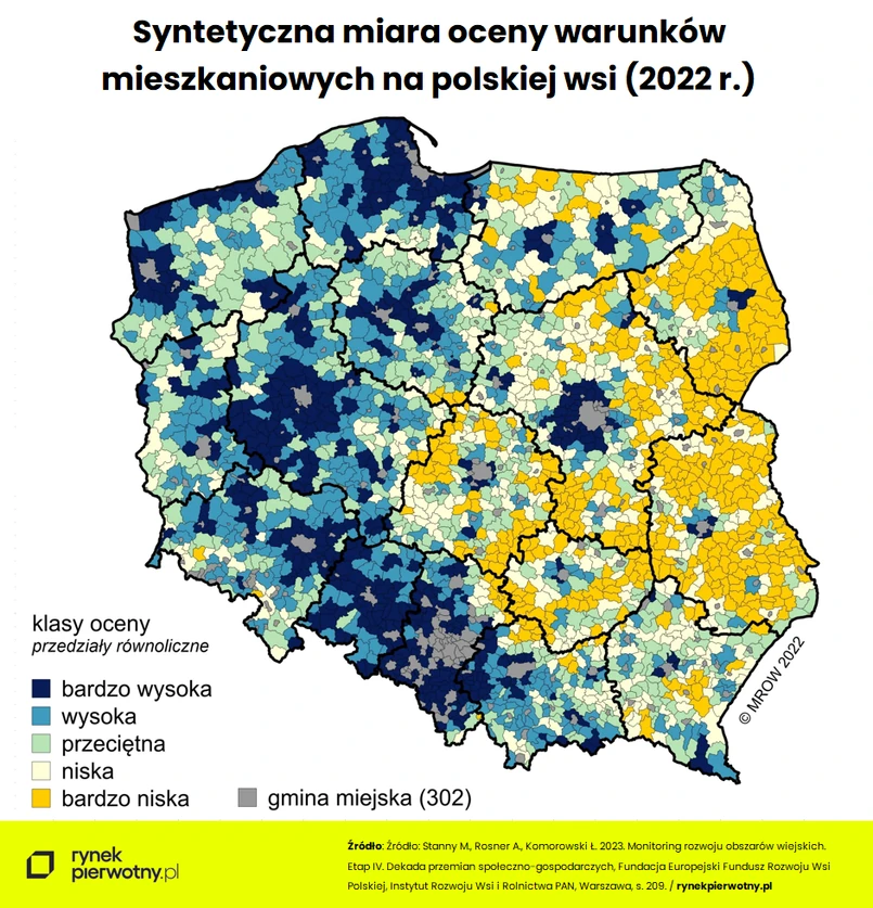 Efektem opisywanej analizy warunków mieszkaniowych na wsi jest poniższa mapa. Autorzy raportu zauważają, że w dalszym ciągu miara oceny warunków mieszkaniowych wykazuje związek z przebiegiem granic zaborów. Na terenie byłego zaboru pruskiego/niemieckiego, wiejskich gmin z najniższą oceną warunków mieszkaniowych jest bardzo mało, a większość z nich znajduje się w granicach obecnego województwa warmińsko-mazurskiego. Pamiętajmy, że Prusy Wschodnie były najgorzej rozwiniętą gospodarczo częścią Królestwa Prus, Cesarstwa Niemieckiego, Republiki Weimarskiej i III Rzeszy. Nawet po dekadach może mieć to wpływ na sytuację mieszkaniową.