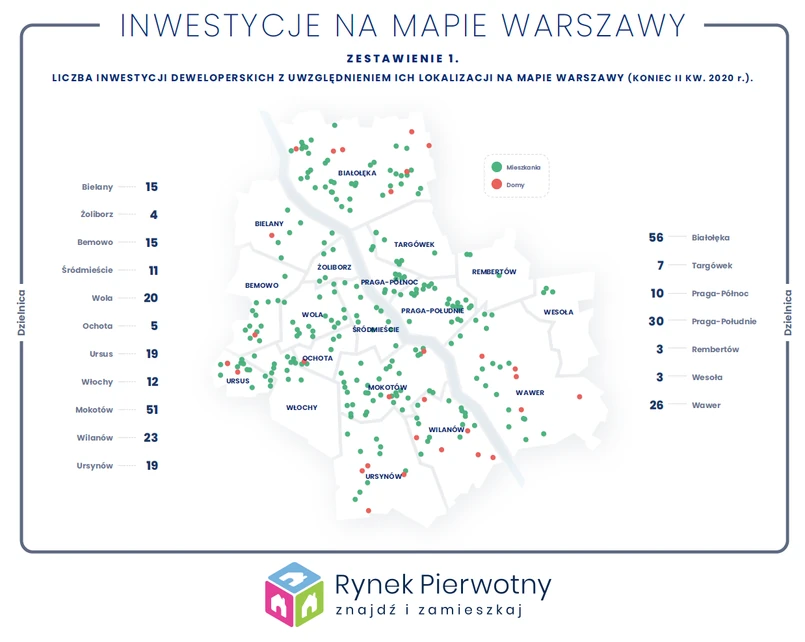 Obecnie najwięcej projektów powstaje na terenie Białołęki oraz Mokotowa. Najmniejszą ofertę nowych inwestycji znaleźć można z kolei w Wesołej, na Rembertowie, Żoliborzu oraz Ochocie. Jeśli zaś chodzi o ogólną liczbę dostępnych mieszkań na terenie całej Warszawy, to odnotowano kwartalny wzrost podaży z 12 010 lokali (na koniec I kw. 2020 roku) do 12 711 lokali (na koniec II kw. 2020 roku).