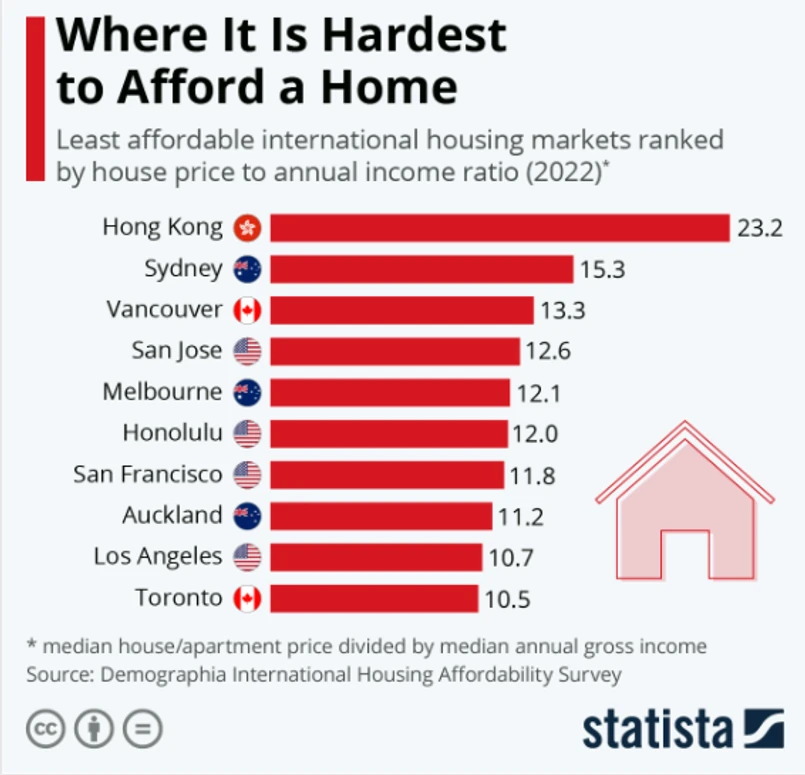 Zdecydowanie najtrudniej przeciętnemu obywatelowi jest o kupno domu w Hongkongu. Kolejne miejsca w zestawieniu zajmują Sydney (Australia), Vancouver (Kanada), San Jose (USA) oraz Melbourne (Australia).