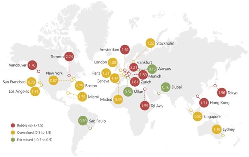 Największe ryzyko pęknięcia bańki cenowej występuje w tej chwili w Toronto i Frankfurcie. Rynki te już teraz wykazują wyraźnie sygnały przegrzania. Podwyższone ryzyko istnieje również w Zurychu, Monachium, Hongkongu, Vancouver, Amsterdamie, Tel Awiwie i Tokio.