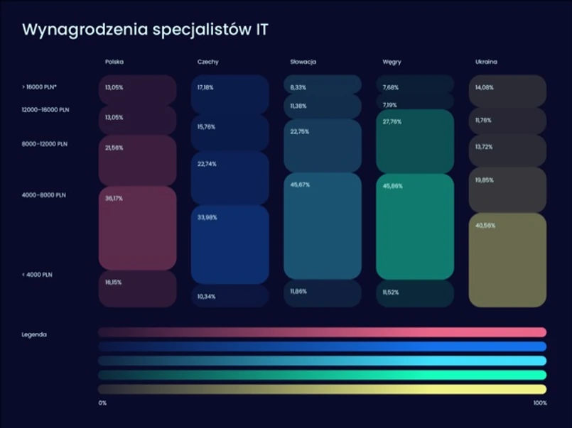 Duże zróżnicowanie w zarobkach można dostrzec na Ukrainie. Powyżej 12 tys. zł netto otrzymuje tam niecałe 26 proc. specjalistów IT. "To odsetek zbliżony do Polski, i znacznie wyższy niż na Słowacji czy Węgrzech, ale aż 40,5 proc. zarabia poniżej 4 tys. zł netto” - czytamy w raporcie No Fluff Jobs.