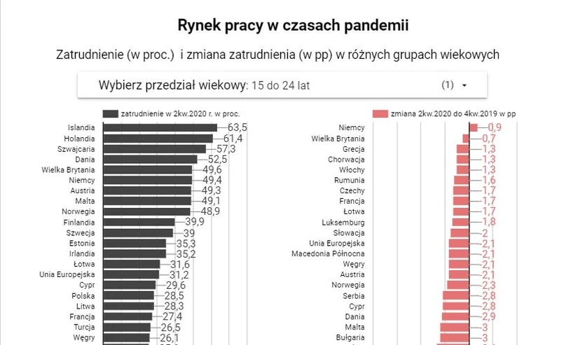 W Polsce w ciągu pół roku w najmłodszej grupie wiekowej wskaźnik zatrudnienia obniżył się o 3,6 p.p. W czwartym kwartale 2019 r. pracowało 32,1 proc. osób w wieku w wieku 15-24 lat, podczas gdy w drugim kwartale 2020 r. wskaźnik zatrudnienia wynosił 28,5 proc. W grupie wiekowej 25-54 lata zatrudnienie spadło z 83 proc. do 82,6 proc., czyli o 0,4 p.p. Natomiast w najstarszej grupie wiekowej (55-64 lata) w ciągu 6 miesięcy tego roku zatrudnienie wzrosło o 0,8 p.p. Pod koniec ubiegłego roku w Polsce pracowało 49,8 proc. osób w wieku 55-64 lat, podczas gdy w drugim kwartale 50,6 proc.