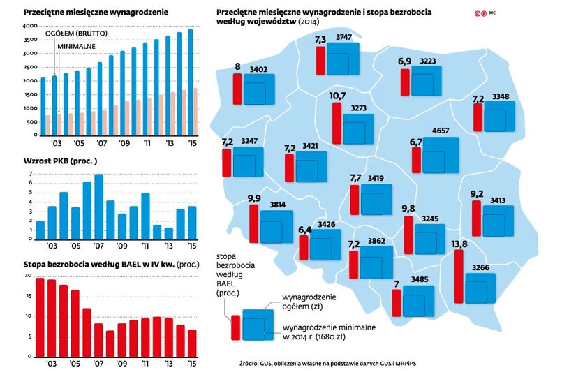 Potwierdzają to oficjalne dane statystyczne. Bo według GUS na przykład w 2002 r. płaca minimalna wynosiła tylko 35,6 proc. przeciętnego wynagrodzenia w gospodarce. A mimo to stopa bezrobocia liczona według BAEL nigdy wcześniej ani później nie była tak wysoka, ponieważ wyniosła 19,7 proc. Natomiast, gdy po 13 latach podwyżek, płaca minimalna wzrosła w ubiegłym roku do 44,9 proc. przeciętnej płacy to stopa bezrobocia osiągnęła średnio w kraju poziom 6,9 proc. Bezrobocie spadało także w najsłabszych województwach (podkarpackim, świętokrzyskim, podlaskim i warmińsko-mazurskim), gdy płaca minimalna wzrosła w nich w tym czasie z ok. 40 proc. do ponad 50 proc. Stopa bezrobocia skurczyła się tam z 18-25 proc. w 2002 r. do 6,6-11,7 proc. w roku ubiegłym.