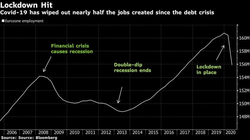 Bezrobocie w USA osiągnęło dwucyfrowy poziom, jednak w Europie jest na wyraźnie niższym poziomie. To w dużej mierze zasługa programów bezpłatnych urlopów. Jednak nie potrwa to długo. Bloomberg prognozuje, że pod koniec roku wskaźnik bezrobocia dla strefy euro zbliży się do 10 proc. i tylko nieznacznie poprawi się w przyszłym roku.