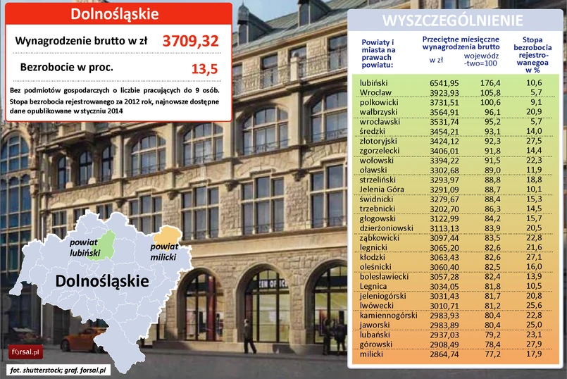 11 Dobrze jest zarabiać na Śląsku. Nie dość, że średnia pensja w wysokości 3 855 zł zajmuje drugie miejsce w Polsce, zaraz po Mazowszu, to jeszcze stolica regionu nie przejęła większości zysków. Śląsk nie jest jednak pozbawiony dysproporcji zarobków. Różnica pomiędzy najbogatszym i najbiedniejszym powiatem przekracza… 3 300 zł. W Jastrzębiu szczęśliwi pracownicy zanotują na kontach średnio 5 974 zł, podczas gdy w najmniej zamożnym powiecie kłobuckim dostaną jedynie 2 661 zł. Średnią pensję w okolicy 3 300 zł brutto oferują na Śląsku główne miasta – Chorzów, Sosnowiec, Bytom, Ruda Śląska, a także Częstochowa. Tradycyjnie Śląsk koncentrował się na węglu i stali, ale w ciągu ostatniej dekady mocno rozwinęła się także motoryzacja. Fabryki mają tu Fiat, Opel, Isuzu. Kwitnie także przemysł lotniczy, powstają tu elementy silników Boeinga, samoloty Orka i samoloty dla polskiej armii.