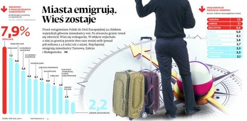 Emigracja miast to też po części efekt statystyczny (są one liczniejsze, mieszka w nich więcej Polaków niż na wsi – ponad 60 proc.).