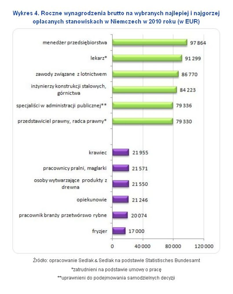 W zeszłym roku wynagrodzenie realne w Niemczech wzrosło o 0,5 proc., poniżej poziomu inflacji, która wyniosła 2 proc. Średnia roczna płaca w przemyśle i usługach wyniosła 44 991 euro. Najlepiej płacono pracownikom w sektorze finansów i ubezpieczeń – średnie roczne wynagrodzenie wyniosło tam 64 576 euro (270 265 zł). Wysokie zarobki zaobserwowano też w wytwarzaniu i zaopatrywaniu w energię, gaz, parę wodną i powietrze do układów klimatyzacyjnych, a także w branży informacyjnej i komunikacyjnej.