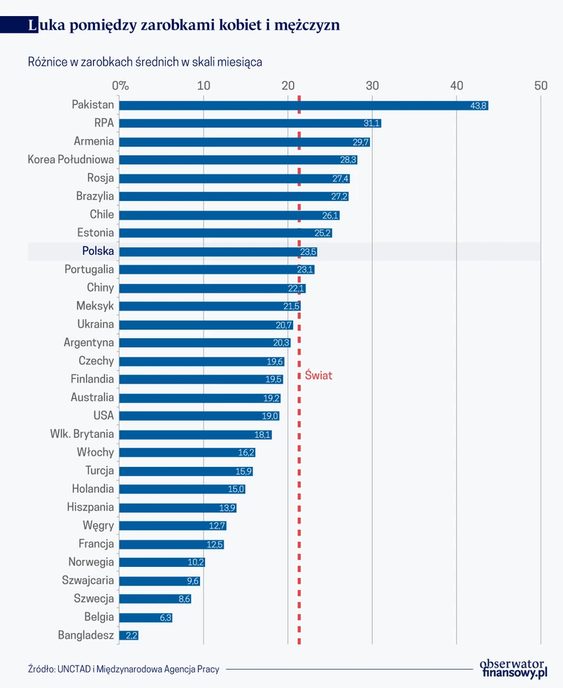 Polska na tle tego światowego porównania wygląda na kraj, w którym kobiety mają jeszcze sporo do wywalczenia. Z dokumentacji MOP i UNCTAD wynika, że luka w poziomie średnich zarobków osiąganych przez kobiety i mężczyzn wykonujących podobną pracę, legitymujących się podobnym wykształceniem sięga aż 23,5 proc. To nie licząc Estonii, najwyższy poziom wśród krajów Unii Europejskiej i generalnie jeden z wyższych w świecie.